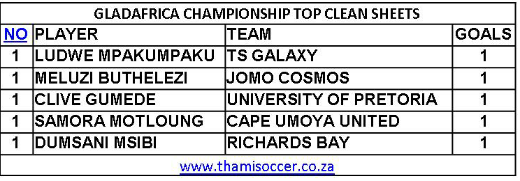 GladAfrica Championship Top Clean Sheets 24 August 2019 Posted on 2019-08-242019-08-24 By Thami Mshengu No Comments on GladAfrica Championship Top Clean Sheets 24 August 2019 (Visited 20 times, 1 visits today)Share this:TwitterWhatsAppPrintTumblrLinkedInFacebookTelegramRedditPocket Related Motsepe Foundation Championship