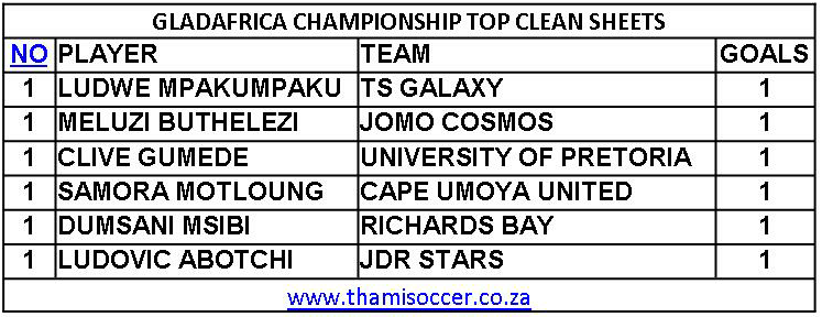 GladAfrica Championship Top Clean Sheets 25 August 2019 Posted on 2019-08-25 By Thami Mshengu No Comments on GladAfrica Championship Top Clean Sheets 25 August 2019 (Visited 28 times, 1 visits today)Share this:TwitterWhatsAppPrintTumblrLinkedInFacebookTelegramRedditPocket Related Motsepe Foundation Championship