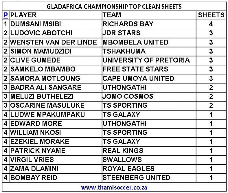 GladAfrica Championship Top Clean Sheets 25 October 2019 Posted on 2019-10-252019-10-27 By Thami Mshengu No Comments on GladAfrica Championship Top Clean Sheets 25 October 2019 (Visited 27 times, 1 visits today)Share this:TwitterWhatsAppPrintTumblrLinkedInFacebookTelegramRedditPocket Related Motsepe Foundation Championship