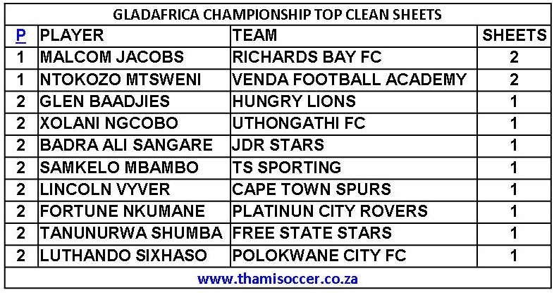 GladAfrica Championship Top Clean Sheets 28 August 2021 Posted on 2021-08-292021-09-12 By Thami Mshengu No Comments on GladAfrica Championship Top Clean Sheets 28 August 2021 (Visited 39 times, 1 visits today)Share this:TwitterWhatsAppPrintTumblrLinkedInFacebookTelegramRedditPocket Related Motsepe Foundation Championship Tags:Malcolm Jacobs, Ntokozo Mtsweni