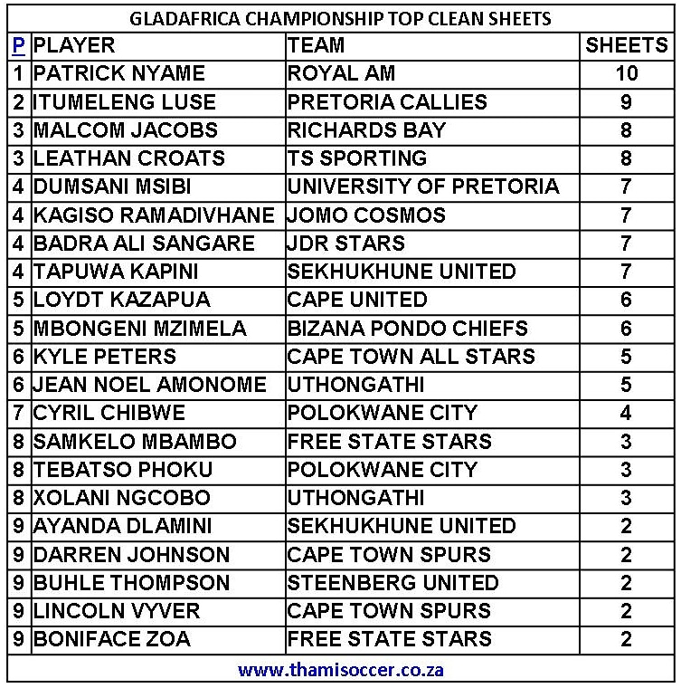 GladAfrica Championship Top Clean Sheets 7 April 2021 Posted on 2021-04-082021-04-08 By Thami Mshengu No Comments on GladAfrica Championship Top Clean Sheets 7 April 2021 (Visited 42 times, 1 visits today)Share this:TwitterWhatsAppPrintTumblrLinkedInFacebookTelegramRedditPocket Related Motsepe Foundation Championship Tags:Patrick Nyame