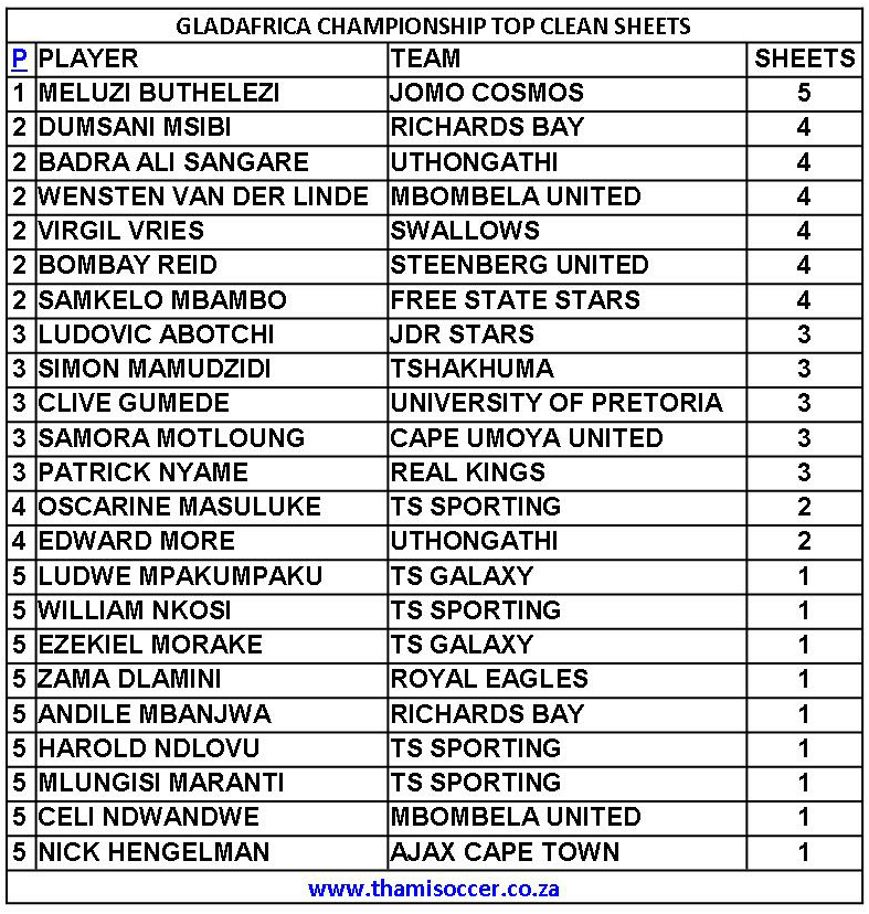GladAfrica Championship Top Clean Sheets 8 December 2019 Posted on 2019-12-09 By Thami Mshengu No Comments on GladAfrica Championship Top Clean Sheets 8 December 2019 (Visited 25 times, 1 visits today)Share this:TwitterWhatsAppPrintTumblrLinkedInFacebookTelegramRedditPocket Related Motsepe Foundation Championship