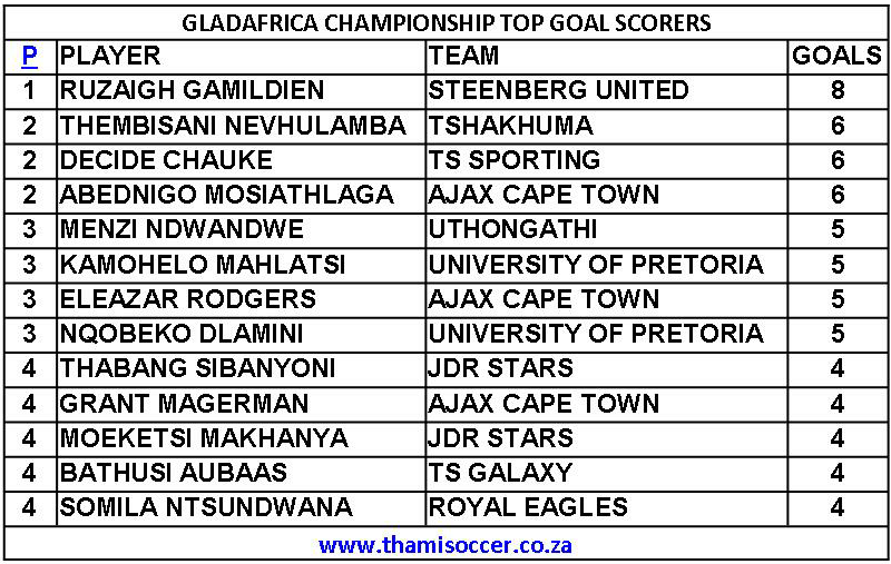 GladAfrica Championship Top Goal Scorers 10 November 2019 Posted on 2019-11-11 By Thami Mshengu No Comments on GladAfrica Championship Top Goal Scorers 10 November 2019 (Visited 18 times, 1 visits today)Share this:TwitterWhatsAppPrintTumblrLinkedInFacebookTelegramRedditPocket Related Motsepe Foundation Championship