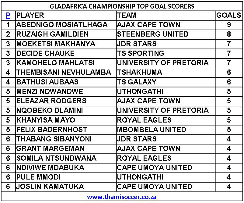 GladAfrica Championship Top Goal Scorers 13 December 2019 Posted on 2019-12-13 By Thami Mshengu No Comments on GladAfrica Championship Top Goal Scorers 13 December 2019 (Visited 15 times, 1 visits today)Share this:TwitterWhatsAppPrintTumblrLinkedInFacebookTelegramRedditPocket Related Motsepe Foundation Championship