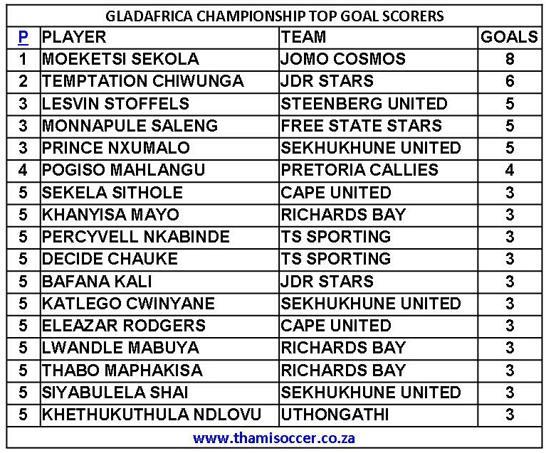 GladAfrica Championship Top Goal Scorers 13 February 2021 Posted on 2021-02-142021-02-14 By Thami Mshengu No Comments on GladAfrica Championship Top Goal Scorers 13 February 2021 (Visited 12 times, 1 visits today)Share this:TwitterWhatsAppPrintTumblrLinkedInFacebookTelegramRedditPocket Related Motsepe Foundation Championship Tags:Moeketsi Sekola