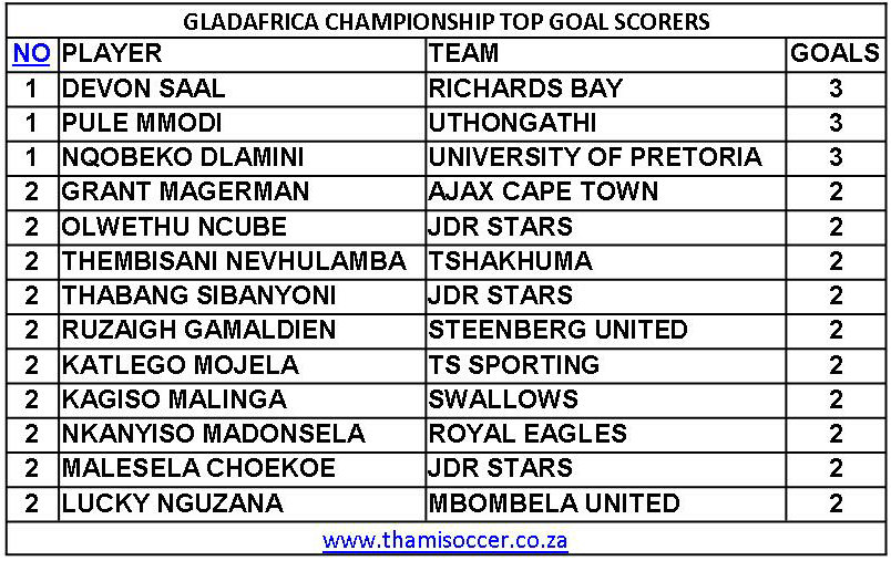 GladAfrica Championship Top Goal Scorers 14 September 2019 Posted on 2019-09-14 By Thami Mshengu No Comments on GladAfrica Championship Top Goal Scorers 14 September 2019 (Visited 20 times, 1 visits today)Share this:TwitterWhatsAppPrintTumblrLinkedInFacebookTelegramRedditPocket Related Motsepe Foundation Championship