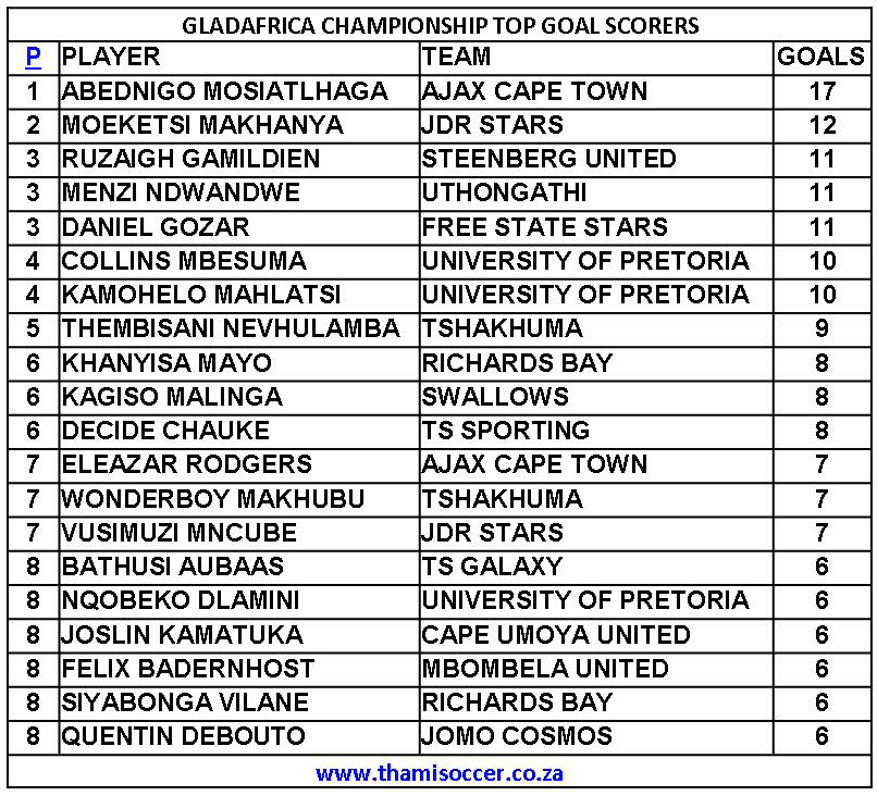GladAfrica Championship Top Goal Scorers 15 August 2020 Posted on 2020-08-162020-08-16 By Thami Mshengu No Comments on GladAfrica Championship Top Goal Scorers 15 August 2020 (Visited 18 times, 1 visits today)Share this:TwitterWhatsAppPrintTumblrLinkedInFacebookTelegramRedditPocket Related Motsepe Foundation Championship
