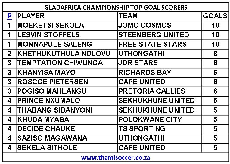 GladAfrica Championship Top Goal Scorers 17 April 2021 Posted on 2021-04-182021-04-22 By Thami Mshengu No Comments on GladAfrica Championship Top Goal Scorers 17 April 2021 (Visited 79 times, 1 visits today)Share this:TwitterWhatsAppPrintTumblrLinkedInFacebookTelegramRedditPocket Related Motsepe Foundation Championship Tags:Lesvin Stoffels, Moeketsi Sekola, Monnapule Saleng