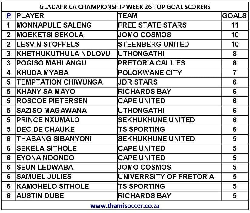 GladAfrica Championship Top Goal Scorers 2 May 2021 Posted on 2021-05-052021-05-05 By Thami Mshengu No Comments on GladAfrica Championship Top Goal Scorers 2 May 2021 (Visited 35 times, 1 visits today)Share this:TwitterWhatsAppPrintTumblrLinkedInFacebookTelegramRedditPocket Related Motsepe Foundation Championship Tags:Monnapule Saleng