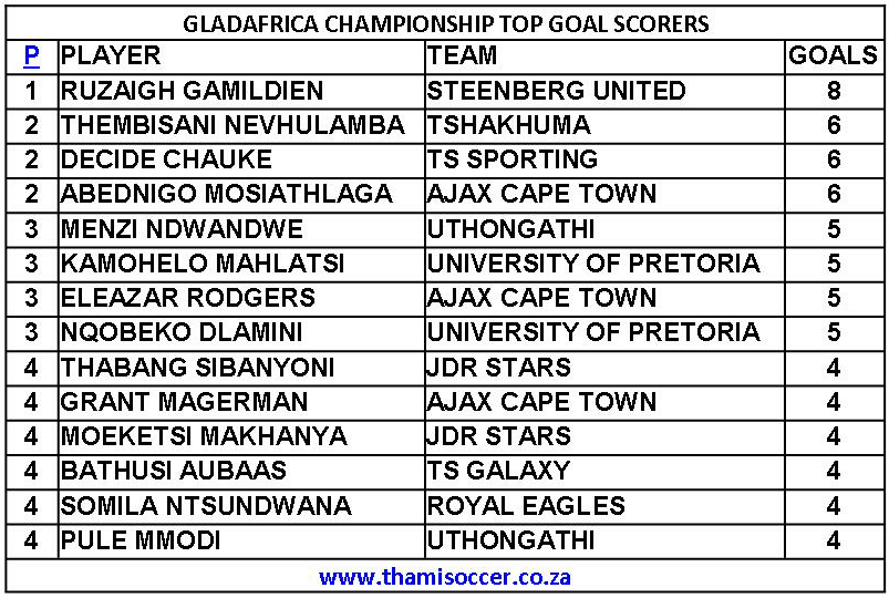 GladAfrica Championship Top Goal Scorers 20 November 2019 Posted on 2019-11-20 By Thami Mshengu No Comments on GladAfrica Championship Top Goal Scorers 20 November 2019 (Visited 15 times, 1 visits today)Share this:TwitterWhatsAppPrintTumblrLinkedInFacebookTelegramRedditPocket Related Motsepe Foundation Championship