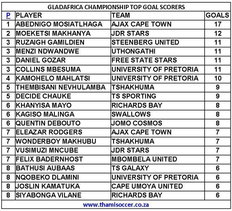 GladAfrica Championship Top Goal Scorers 22 August 2020 Posted on 2020-08-232020-08-23 By Thami Mshengu No Comments on GladAfrica Championship Top Goal Scorers 22 August 2020 (Visited 32 times, 1 visits today)Share this:TwitterWhatsAppPrintTumblrLinkedInFacebookTelegramRedditPocket Related Betway Premiership