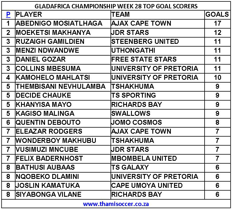 GladAfrica Championship Top Goal Scorers 23 August 2020 Posted on 2020-08-242020-08-24 By Thami Mshengu No Comments on GladAfrica Championship Top Goal Scorers 23 August 2020 (Visited 49 times, 1 visits today)Share this:TwitterWhatsAppPrintTumblrLinkedInFacebookTelegramRedditPocket Related Motsepe Foundation Championship