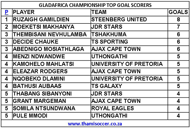GladAfrica Championship Top Goal Scorers 23 November 2019 Posted on 2019-11-232019-11-23 By Thami Mshengu No Comments on GladAfrica Championship Top Goal Scorers 23 November 2019 (Visited 12 times, 1 visits today)Share this:TwitterWhatsAppPrintTumblrLinkedInFacebookTelegramRedditPocket Related Motsepe Foundation Championship