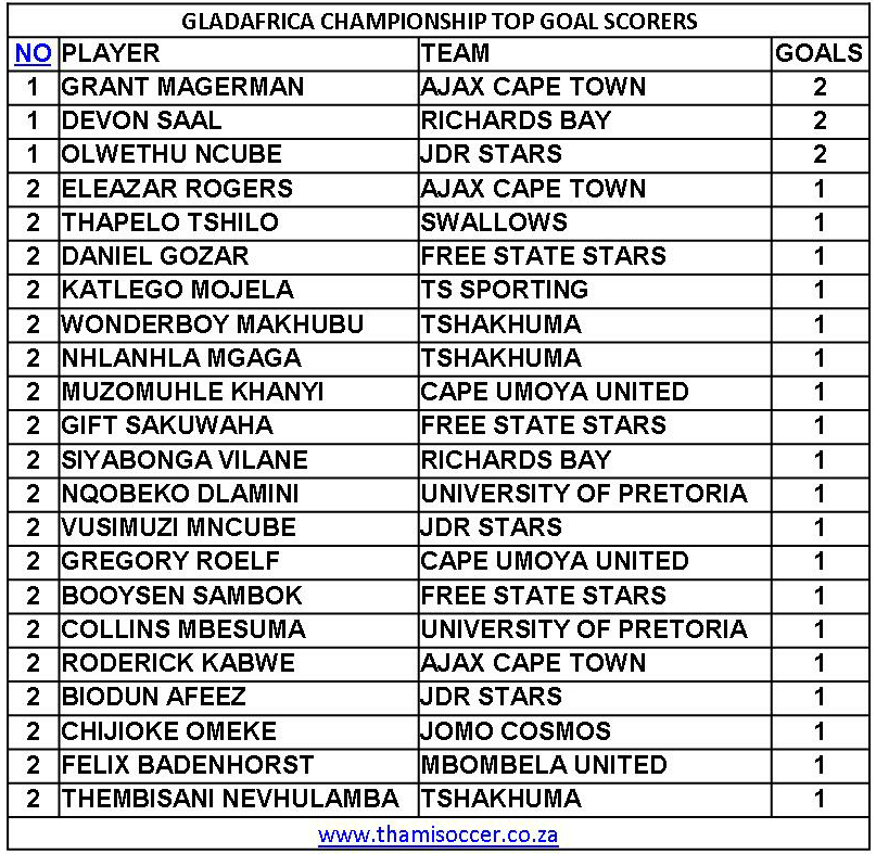 GladAfrica Championship Top Goal Scorers 25 August 2019 Posted on 2019-08-252019-08-26 By Thami Mshengu No Comments on GladAfrica Championship Top Goal Scorers 25 August 2019 (Visited 14 times, 1 visits today)Share this:TwitterWhatsAppPrintTumblrLinkedInFacebookTelegramRedditPocket Related Motsepe Foundation Championship