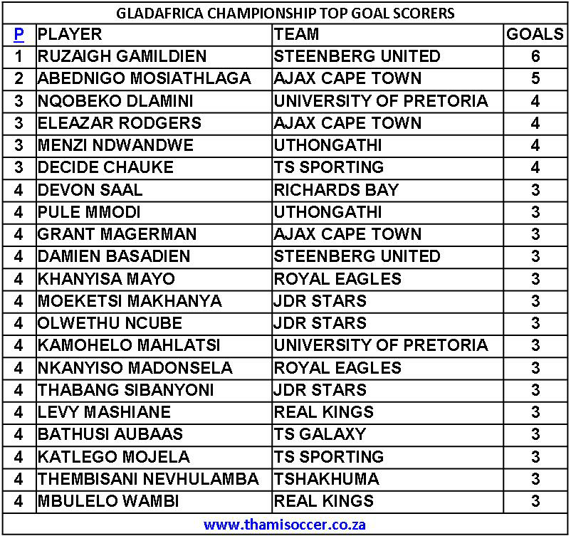 GladAfrica Championship Top Goal Scorers 26 October 2019 Posted on 2019-10-262019-10-27 By Thami Mshengu No Comments on GladAfrica Championship Top Goal Scorers 26 October 2019 (Visited 18 times, 1 visits today)Share this:TwitterWhatsAppPrintTumblrLinkedInFacebookTelegramRedditPocket Related Motsepe Foundation Championship