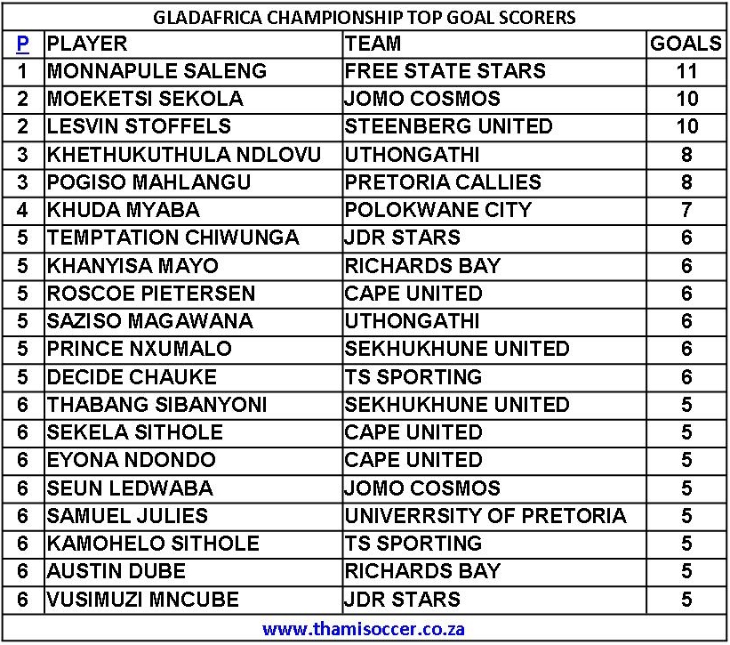 GladAfrica Championship Top Goal Scorers 4 May 2021 Posted on 2021-05-062021-05-06 By Thami Mshengu No Comments on GladAfrica Championship Top Goal Scorers 4 May 2021 (Visited 43 times, 1 visits today)Share this:TwitterWhatsAppPrintTumblrLinkedInFacebookTelegramRedditPocket Related Motsepe Foundation Championship Tags:Monnapule Saleng