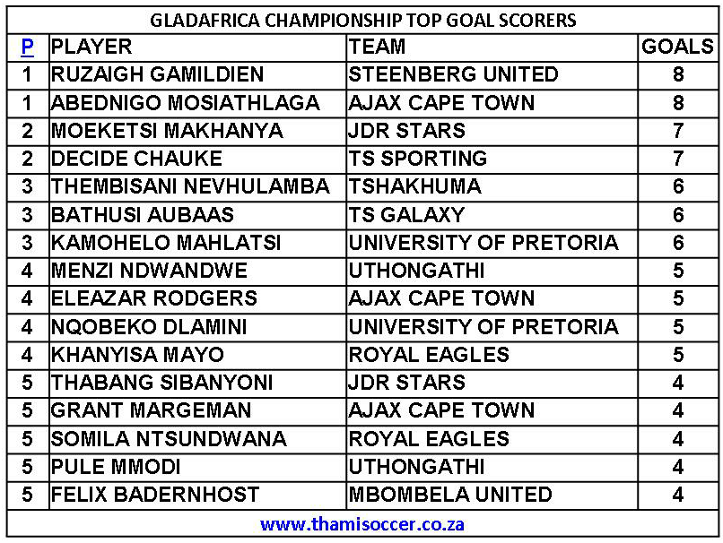 GladAfrica Championship Top Goal Scorers 7 December 2019 Posted on 2019-12-08 By Thami Mshengu 1 Comment on GladAfrica Championship Top Goal Scorers 7 December 2019 (Visited 21 times, 1 visits today)Share this:TwitterWhatsAppPrintTumblrLinkedInFacebookTelegramRedditPocket Related Motsepe Foundation Championship
