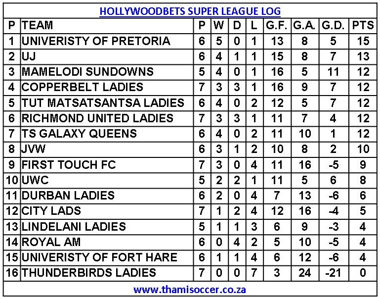 Hollywoodbets Super League Log 13 April 2024 Posted on 2024-04-132024-04-14 By Thami Mshengu No Comments on Hollywoodbets Super League Log 13 April 2024 (Visited 52 times, 1 visits today)Share this:TwitterWhatsAppPrintTumblrLinkedInFacebookTelegramRedditPocket Related Hollywoodbets Super League Tags:University of Pretoria