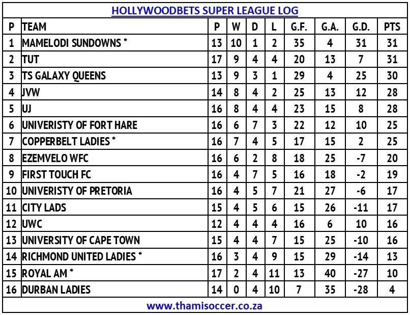 Hollywoodbets Super League Log 2 August 2025 Posted on 2025-08-022025-08-04 By Thami Mshengu No Comments on Hollywoodbets Super League Log 2 August 2025 (Visited 15 times, 1 visits today)Share this:TwitterWhatsAppPrintTumblrLinkedInFacebookTelegramRedditPocket Related Hollywoodbets Super League Tags:Mamelodi Sundowns Ladies