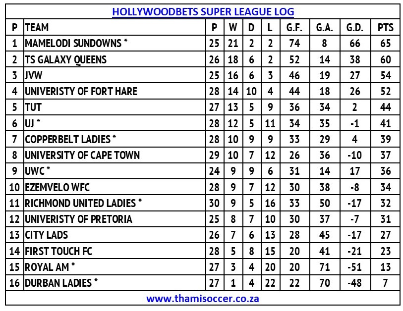 Hollywoodbets Super League Log 2 November 2025 Posted on 2025-11-022025-11-06 By Thami Mshengu No Comments on Hollywoodbets Super League Log 2 November 2025 (Visited 7 times, 1 visits today)Share this:TwitterWhatsAppPrintTumblrLinkedInFacebookTelegramRedditPocket Related Hollywoodbets Super League Tags:Mamelodi Sundowns Ladies