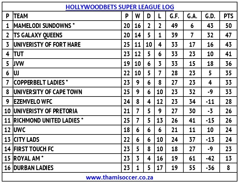 Hollywoodbets Super League Log 24 September 2025 Posted on 2025-09-242025-10-22 By Thami Mshengu No Comments on Hollywoodbets Super League Log 24 September 2025 (Visited 4 times, 1 visits today)Share this:TwitterWhatsAppPrintTumblrLinkedInFacebookTelegramRedditPocket Related Hollywoodbets Super League Tags:Mamelodi Sundowns Ladies