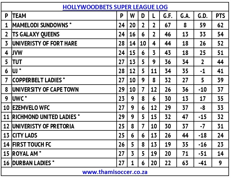 Hollywoodbets Super League Log 25 October 2025 Posted on 2025-10-252025-10-27 By Thami Mshengu No Comments on Hollywoodbets Super League Log 25 October 2025 (Visited 4 times, 4 visits today)Share this:TwitterWhatsAppPrintTumblrLinkedInFacebookTelegramRedditPocket Related Uncategorized Tags:Mamelodi Sundowns Ladies