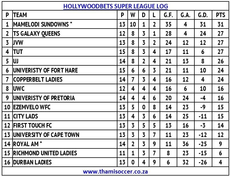 Hollywoodbets Super League Log 28 June 2025 Posted on 2025-06-282025-08-03 By Thami Mshengu No Comments on Hollywoodbets Super League Log 28 June 2025 (Visited 4 times, 1 visits today)Share this:TwitterWhatsAppPrintTumblrLinkedInFacebookTelegramRedditPocket Related Hollywoodbets Super League Tags:Mamelodi Sundowns Ladies