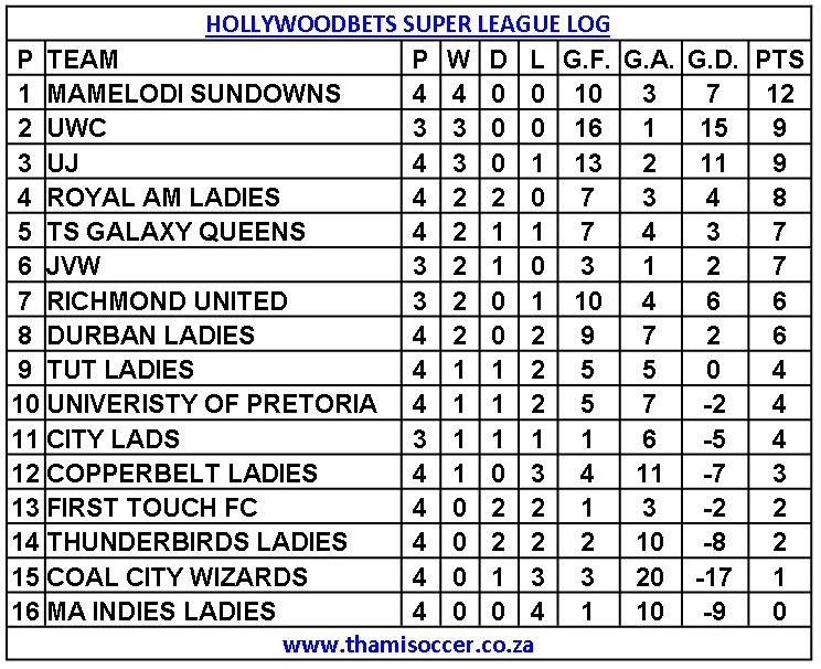 Hollywoodbets Super League Log 5 March 2023 Posted on 2023-03-052023-03-06 By Thami Mshengu No Comments on Hollywoodbets Super League Log 5 March 2023 (Visited 180 times, 1 visits today)Share this:TwitterWhatsAppPrintTumblrLinkedInFacebookTelegramRedditPocket Related Hollywoodbets Super League Tags:Mamelodi Sundowns Ladies