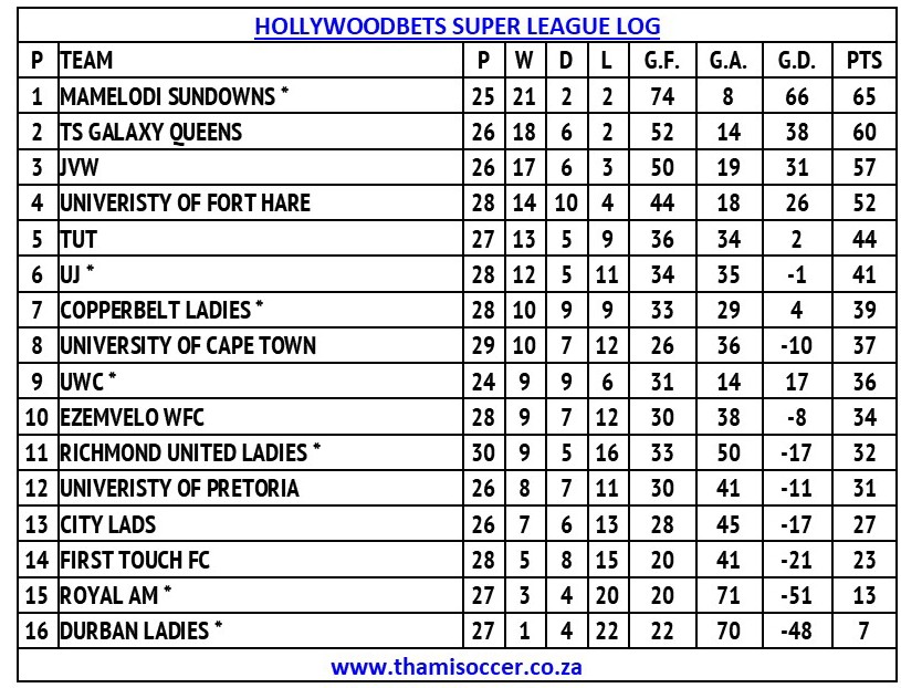 Hollywoodbets Super League Log 5 November 2025 Posted on 2025-11-052025-11-06 By Thami Mshengu No Comments on Hollywoodbets Super League Log 5 November 2025 (Visited 21 times, 1 visits today)Share this:TwitterWhatsAppPrintTumblrLinkedInFacebookTelegramRedditPocket Related Hollywoodbets Super League Tags:Mamelodi Sundowns Ladies
