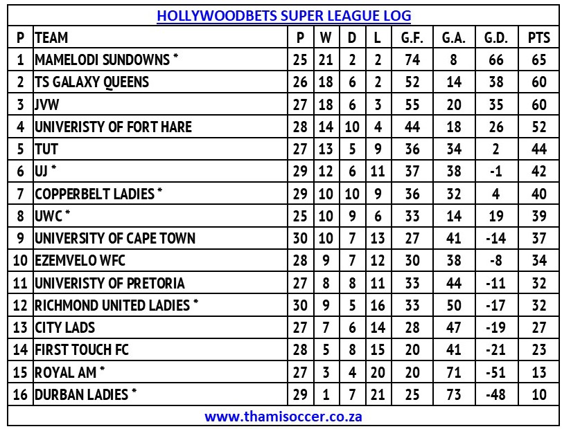 Hollywoodbets Super League Log 8 November 2025 Posted on 2025-11-082025-11-10 By Thami Mshengu No Comments on Hollywoodbets Super League Log 8 November 2025 (Visited 24 times, 5 visits today)Share this:TwitterWhatsAppPrintTumblrLinkedInFacebookTelegramRedditPocket Related Hollywoodbets Super League Tags:Mamelodi Sundowns Ladies