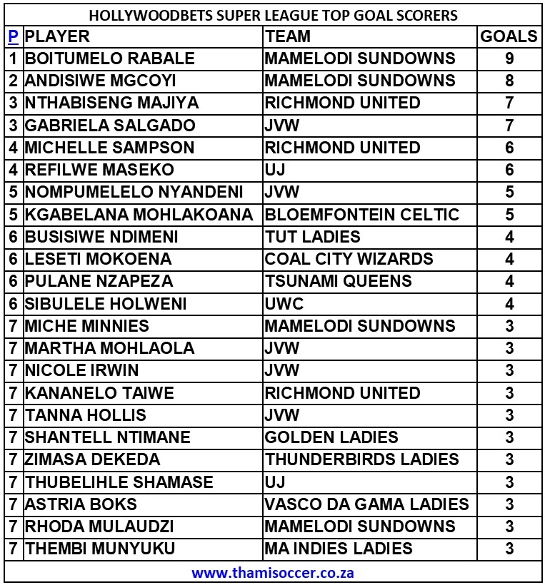 Hollywoodbets Super League Top Goal Scorers 1 June 2022 Posted on 2022-06-022022-06-06 By Thami Mshengu 1 Comment on Hollywoodbets Super League Top Goal Scorers 1 June 2022 (Visited 385 times, 1 visits today)Share this:TwitterWhatsAppPrintTumblrLinkedInFacebookTelegramRedditPocket Related Hollywoodbets Super League Tags:Boitumelo Rabale