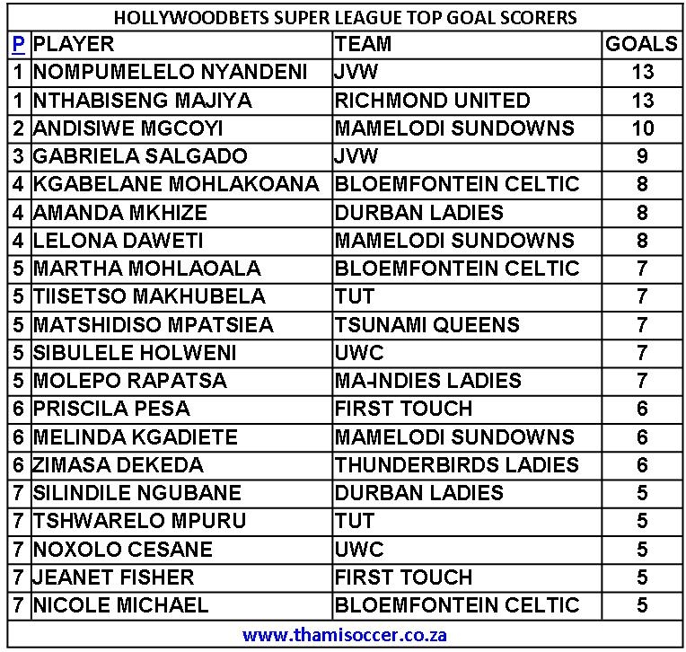 Hollywoodbets Super League Top Goal Scorers 12 September 2021 Posted on 2021-09-152021-09-15 By Thami Mshengu No Comments on Hollywoodbets Super League Top Goal Scorers 12 September 2021 (Visited 52 times, 1 visits today)Share this:TwitterWhatsAppPrintTumblrLinkedInFacebookTelegramRedditPocket Related Hollywoodbets Super League Tags:Nompumelelo Nyandeni, Nthabiseng Majiya