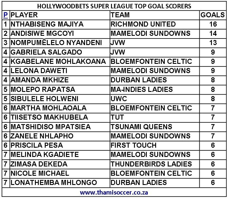 Hollywoodbets Super League Top Goal Scorers 13 October 2021 Posted on 2021-10-142021-10-14 By Thami Mshengu 1 Comment on Hollywoodbets Super League Top Goal Scorers 13 October 2021 (Visited 246 times, 1 visits today)Share this:TwitterWhatsAppPrintTumblrLinkedInFacebookTelegramRedditPocket Related Hollywoodbets Super League Tags:Nthabiseng Majiya