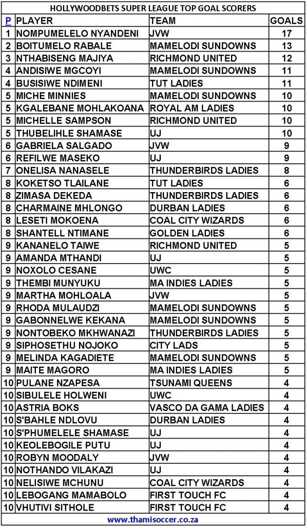 Hollywoodbets Super League Top Goal Scorers 17 September 2022 Posted on 2022-09-172023-03-01 By Thami Mshengu 1 Comment on Hollywoodbets Super League Top Goal Scorers 17 September 2022 (Visited 117 times, 1 visits today)Share this:TwitterWhatsAppPrintTumblrLinkedInFacebookTelegramRedditPocket Related Hollywoodbets Super League Tags:Nompumelelo Nyandeni