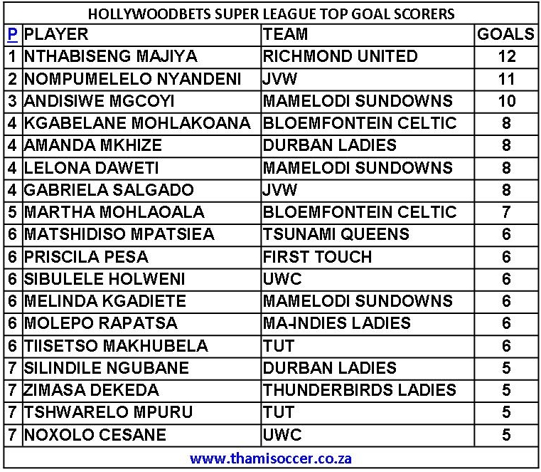 Hollywoodbets Super League Top Goal Scorers 22 August 2021 Posted on 2021-08-252021-08-25 By Thami Mshengu No Comments on Hollywoodbets Super League Top Goal Scorers 22 August 2021 (Visited 20 times, 1 visits today)Share this:TwitterWhatsAppPrintTumblrLinkedInFacebookTelegramRedditPocket Related Hollywoodbets Super League Tags:Nthabiseng Majiya