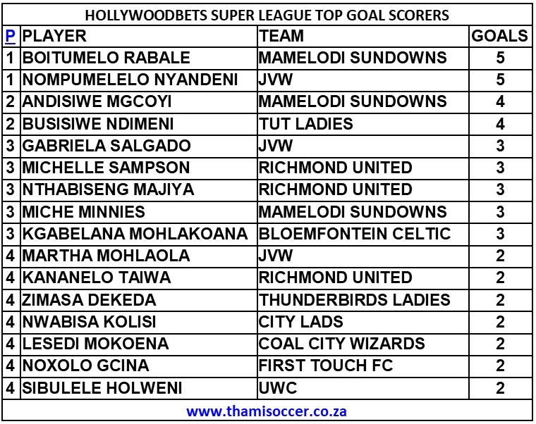 Hollywoodbets Super League Top Goal Scorers 8 May 2022 Posted on 2022-05-092022-05-19 By Thami Mshengu 1 Comment on Hollywoodbets Super League Top Goal Scorers 8 May 2022 (Visited 342 times, 1 visits today)Share this:TwitterWhatsAppPrintTumblrLinkedInFacebookTelegramRedditPocket Related Hollywoodbets Super League Tags:Boitumelo Rabale, Nompumelelo Nyandeni