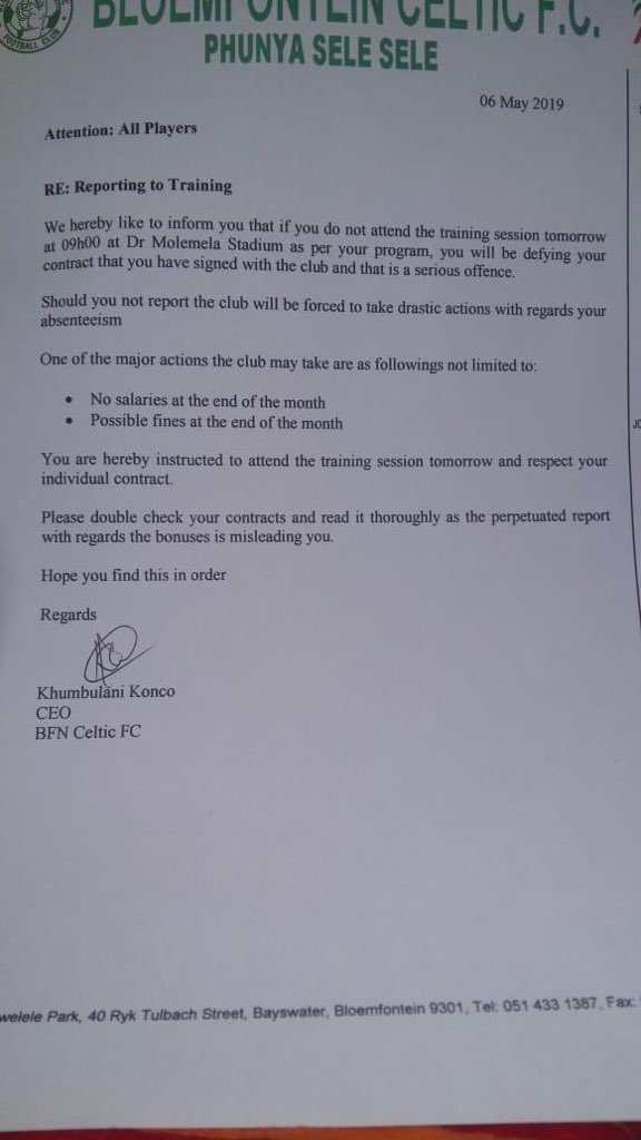 Memo written to Bloemfontein Celtic players yesterday urging them to report to training today or otherwise Posted on 2019-05-07 By Thami Mshengu No Comments on Memo written to Bloemfontein Celtic players yesterday urging them to report to training today or otherwise Photo Credit : Diski Style (Visited 20 times, 1 visits today)Share this:TwitterWhatsAppPrintTumblrLinkedInFacebookTelegramRedditPocket Related Betway Premiership