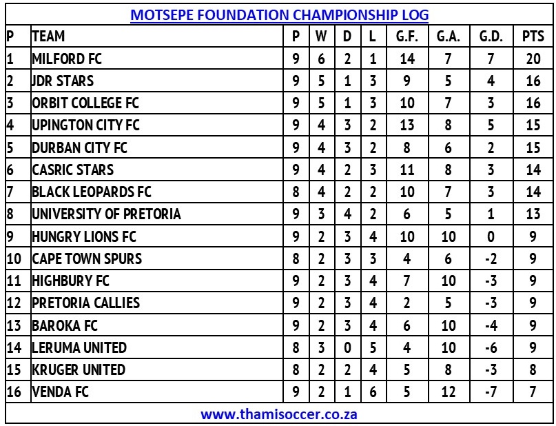 Motsepe Foundation Championship Log 2 November 2024 Posted on 2024-11-022024-11-03 By Thami Mshengu No Comments on Motsepe Foundation Championship Log 2 November 2024 (Visited 33 times, 1 visits today)Share this:TwitterWhatsAppPrintTumblrLinkedInFacebookTelegramRedditPocket Related Motsepe Foundation Championship Tags:Milford FC