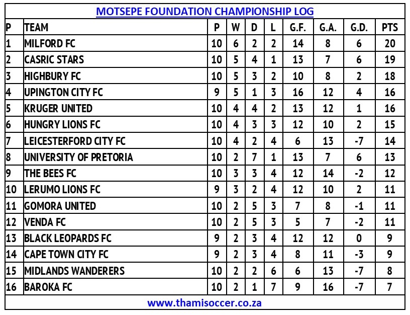 Motsepe Foundation Championship Log 2 November 2025 Posted on 2025-11-022025-11-06 By Thami Mshengu No Comments on Motsepe Foundation Championship Log 2 November 2025 (Visited 5 times, 1 visits today)Share this:TwitterWhatsAppPrintTumblrLinkedInFacebookTelegramRedditPocket Related Motsepe Foundation Championship Tags:Milford FC