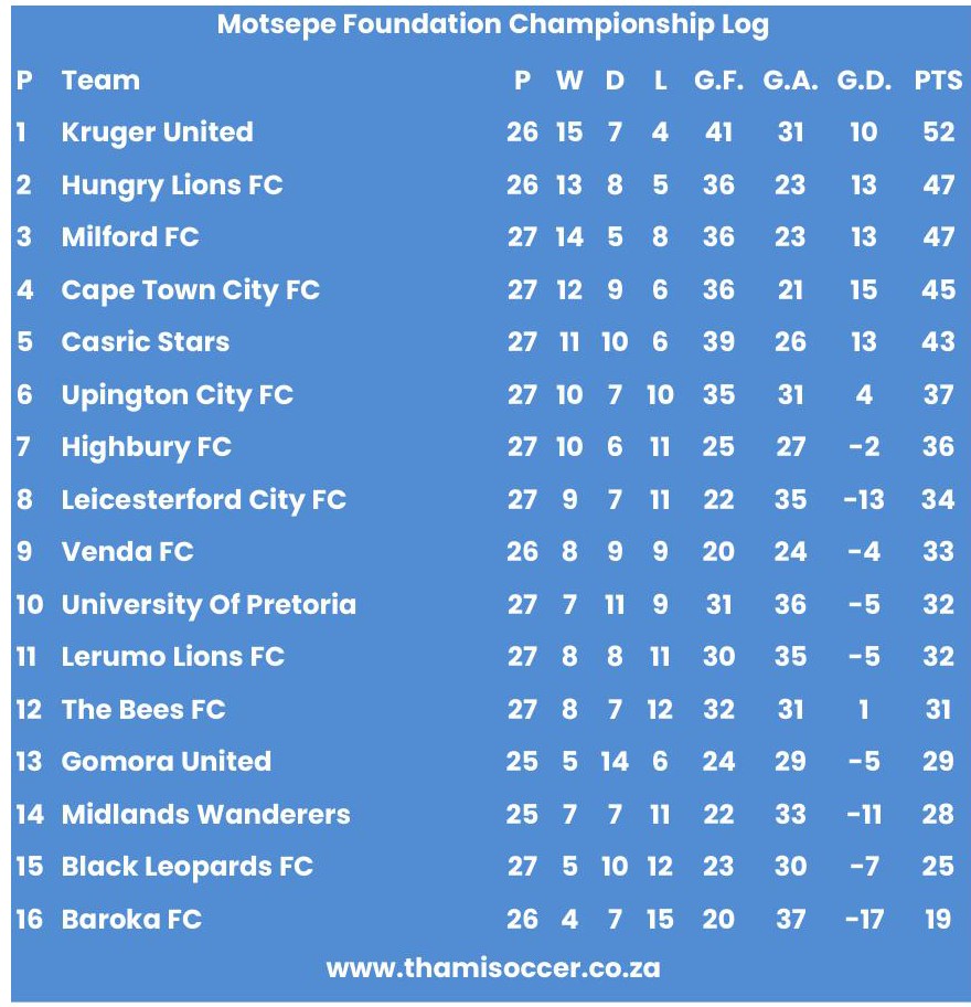 Motsepe Foundation Championship Log 25 April 2026 Posted on 2026-04-252026-04-26 By Thami Mshengu No Comments on Motsepe Foundation Championship Log 25 April 2026 (Visited 16 times, 16 visits today)Share this:TwitterWhatsAppPrintTumblrLinkedInFacebookTelegramRedditPocket Related Motsepe Foundation Championship Tags:Kruger United