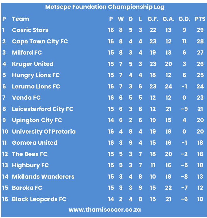 Motsepe Foundation Championship Log 27 January 2026 Posted on 2026-01-272026-01-27 By Thami Mshengu No Comments on Motsepe Foundation Championship Log 27 January 2026 (Visited 64 times, 1 visits today)Share this:TwitterWhatsAppPrintTumblrLinkedInFacebookTelegramRedditPocket Related Motsepe Foundation Championship Tags:Casric Stars