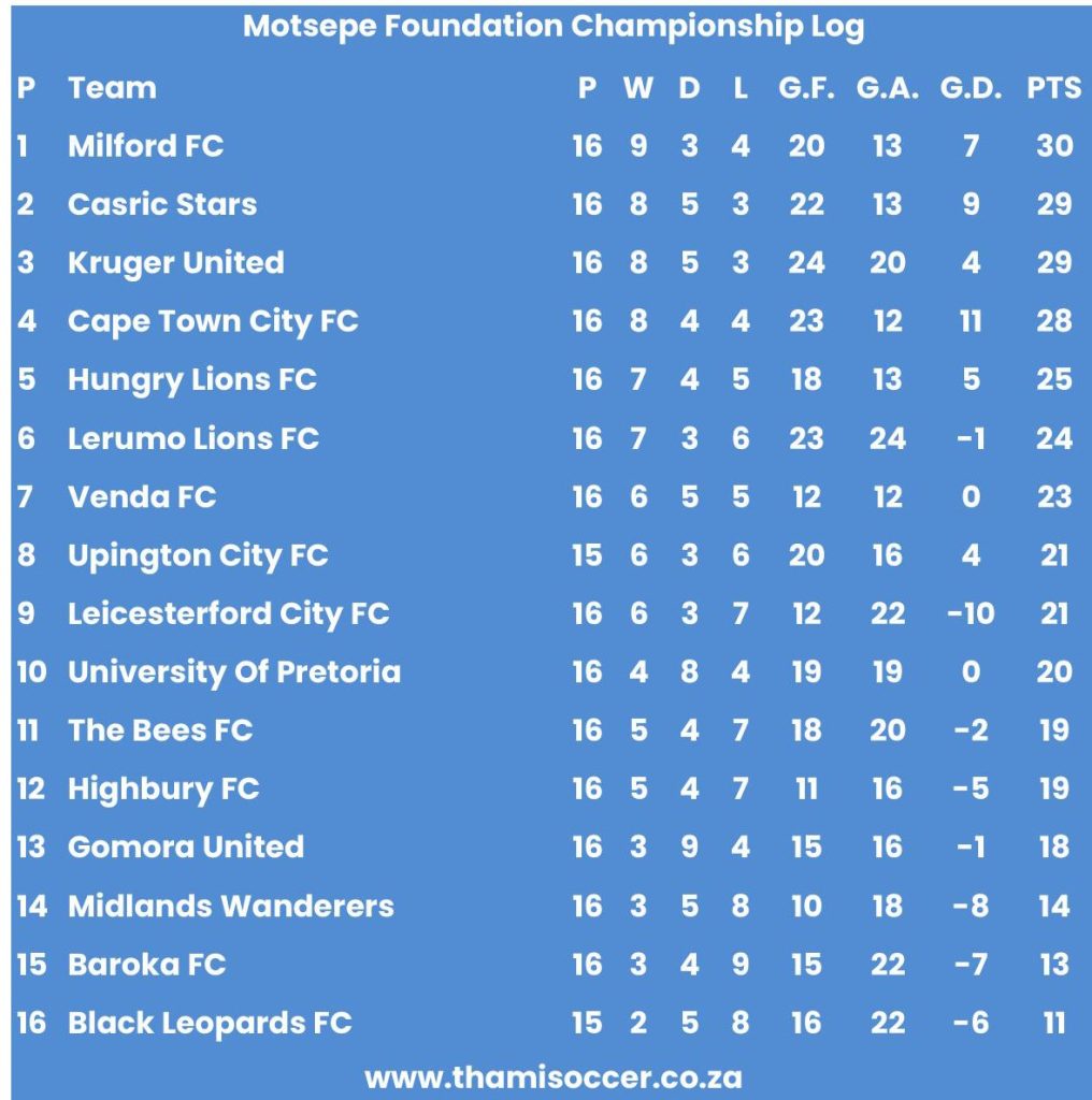 Motsepe Foundation Championship Log 28 January 2026 Posted on 2026-01-282026-01-28 By Thami Mshengu No Comments on Motsepe Foundation Championship Log 28 January 2026 (Visited 46 times, 1 visits today)Share this:TwitterWhatsAppPrintTumblrLinkedInFacebookTelegramRedditPocket Related Motsepe Foundation Championship Tags:Milford FC