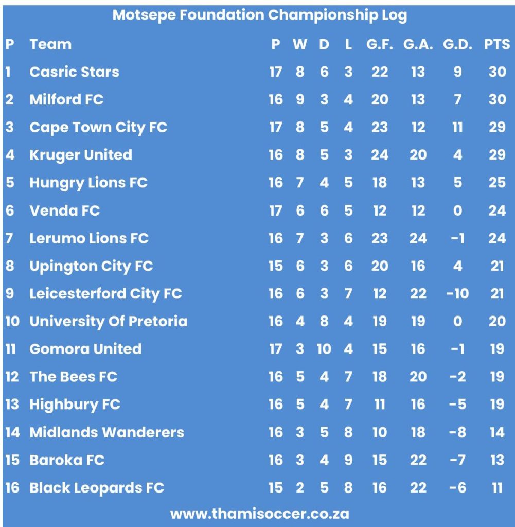Motsepe Foundation Championship Log 30 January 2026 Posted on 2026-01-302026-01-30 By Thami Mshengu No Comments on Motsepe Foundation Championship Log 30 January 2026 (Visited 23 times, 3 visits today)Share this:TwitterWhatsAppPrintTumblrLinkedInFacebookTelegramRedditPocket Related Motsepe Foundation Championship Tags:Casric Stars