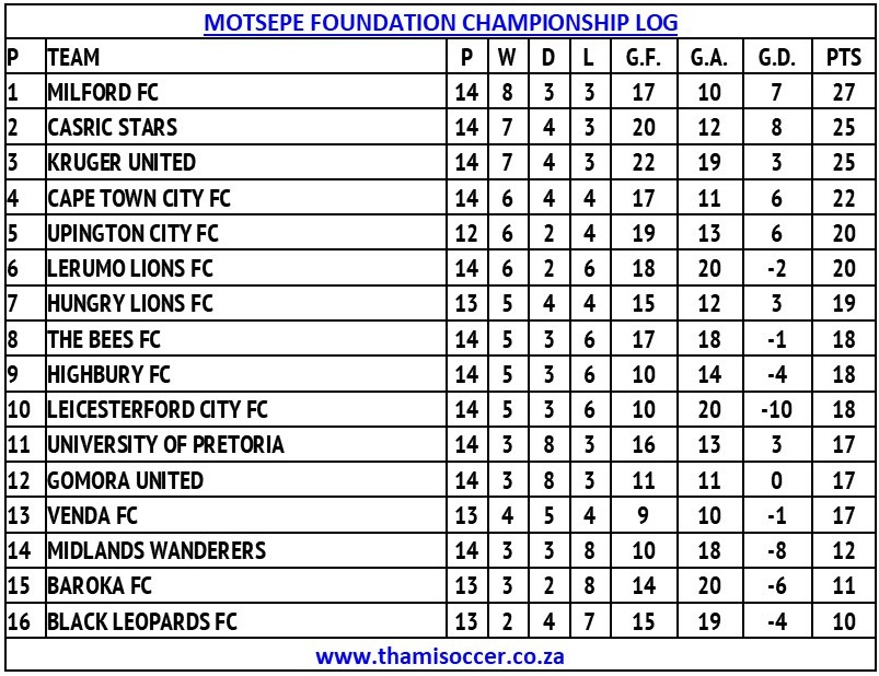 Motsepe Foundation Championship Log 6 December 2025 Posted on 2025-12-062025-12-07 By Thami Mshengu No Comments on Motsepe Foundation Championship Log 6 December 2025 (Visited 27 times, 1 visits today)Share this:TwitterWhatsAppPrintTumblrLinkedInFacebookTelegramRedditPocket Related Motsepe Foundation Championship Tags:Milford FC