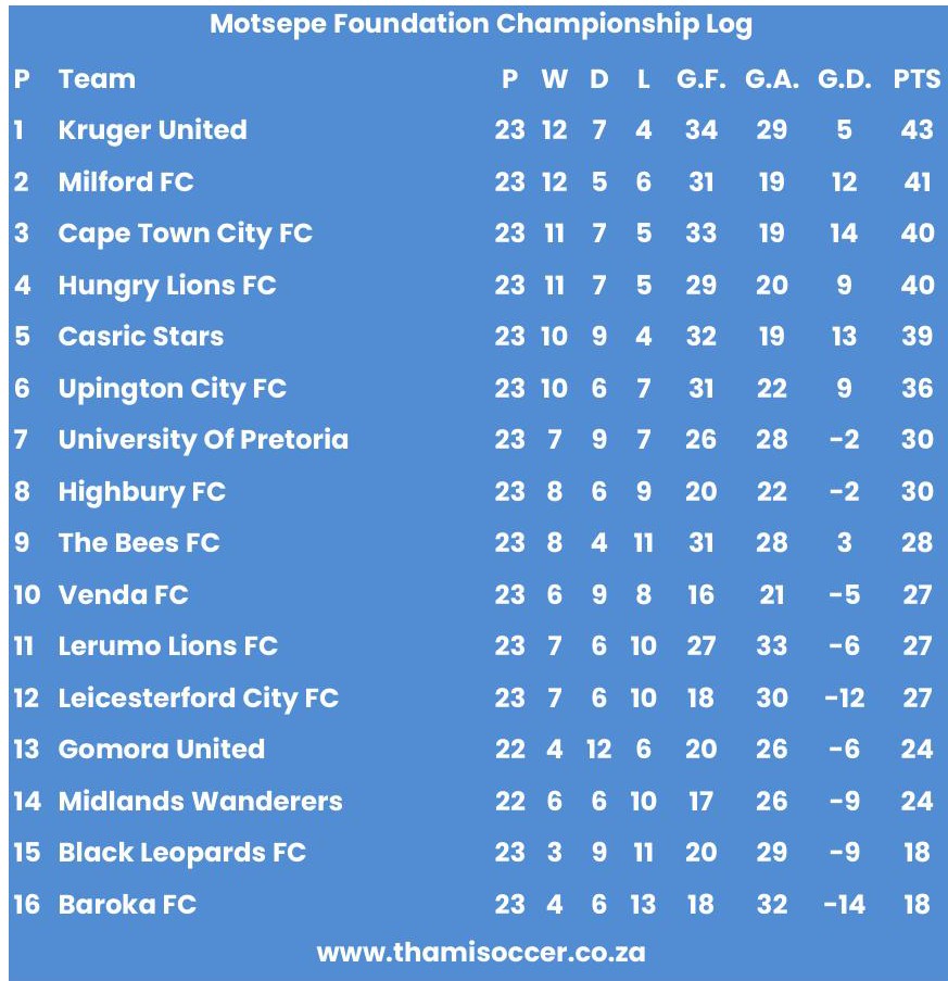 Motsepe Foundation Championship Log 8 April 2026 Posted on 2026-04-082026-04-08 By Thami Mshengu No Comments on Motsepe Foundation Championship Log 8 April 2026 (Visited 79 times, 1 visits today)Share this:TwitterWhatsAppPrintTumblrLinkedInFacebookTelegramRedditPocket Related Motsepe Foundation Championship Tags:Kruger United