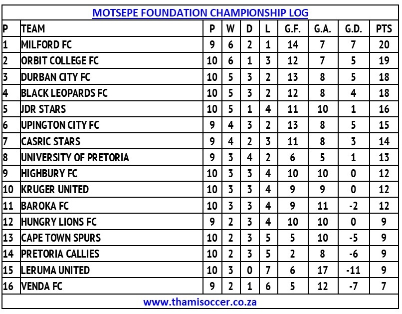 Motsepe Foundation Championship Log 9 November 2024 Posted on 2024-11-092024-11-10 By Thami Mshengu No Comments on Motsepe Foundation Championship Log 9 November 2024 (Visited 88 times, 1 visits today)Share this:TwitterWhatsAppPrintTumblrLinkedInFacebookTelegramRedditPocket Related Motsepe Foundation Championship Tags:Milford FC