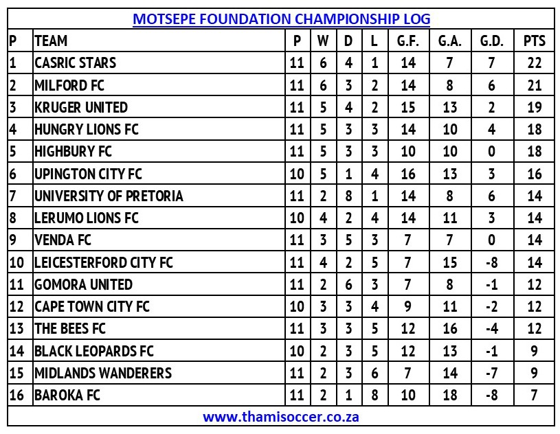 Motsepe Foundation Championship Log 9 November 2025 Posted on 2025-11-092025-11-10 By Thami Mshengu No Comments on Motsepe Foundation Championship Log 9 November 2025 (Visited 20 times, 2 visits today)Share this:TwitterWhatsAppPrintTumblrLinkedInFacebookTelegramRedditPocket Related Motsepe Foundation Championship Tags:Casric Stars