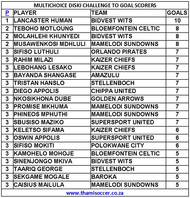 MultiChoice Diski Challenge Week 14 Top Goal Scorers Posted on 2019-11-182019-11-19 By Thami Mshengu No Comments on MultiChoice Diski Challenge Week 14 Top Goal Scorers (Visited 228 times, 1 visits today)Share this:TwitterWhatsAppPrintTumblrLinkedInFacebookTelegramRedditPocket Related DStv Diski Challenge
