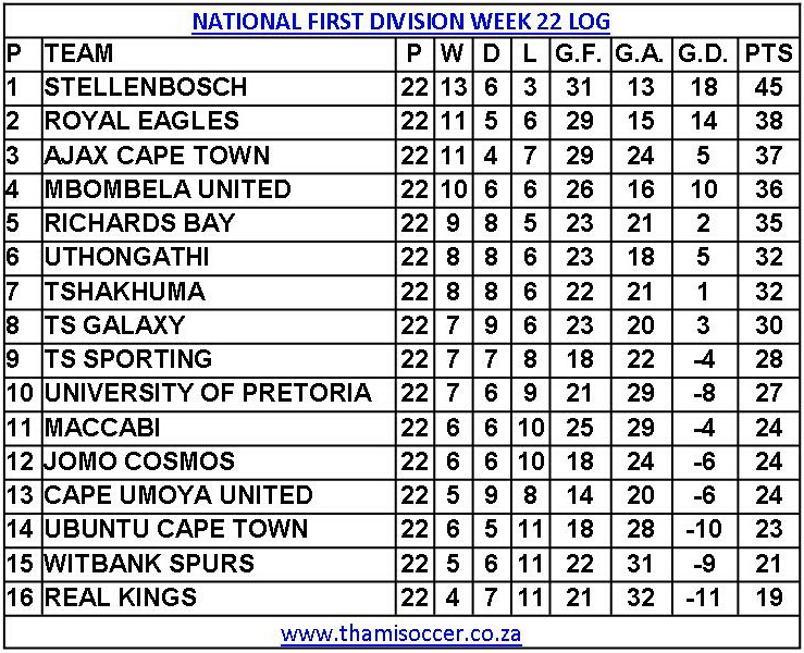 National First Division Week 22 Log Posted on 2019-03-03 By Thami Mshengu No Comments on National First Division Week 22 Log (Visited 100 times, 1 visits today)Share this:TwitterWhatsAppPrintTumblrLinkedInFacebookTelegramRedditPocket Related Motsepe Foundation Championship
