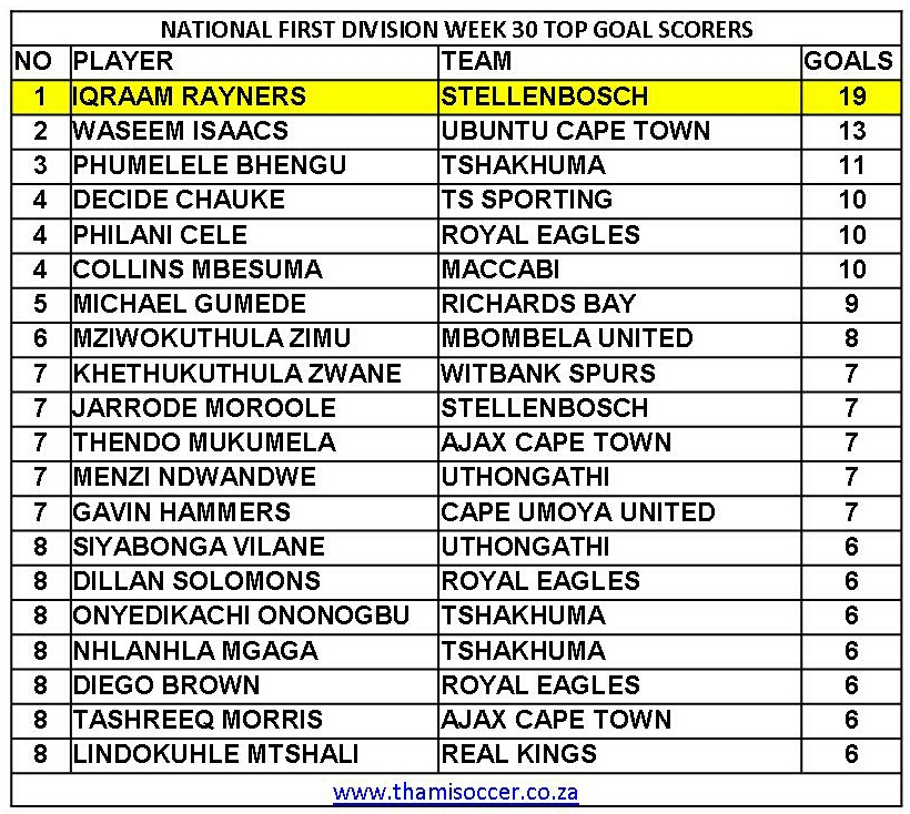 National First Division Week 30 Top Goal Scorers Posted on 2019-05-072021-01-29 By Thami Mshengu 1 Comment on National First Division Week 30 Top Goal Scorers (Visited 16 times, 1 visits today)Share this:TwitterWhatsAppPrintTumblrLinkedInFacebookTelegramRedditPocket Related Motsepe Foundation Championship